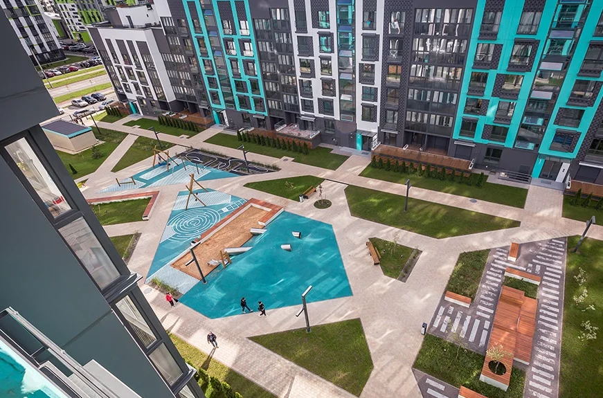 Дворы многоквартирных зданий свободны от машин. Там устроены уютные двухуровневые зоны как для уединенной релаксации, так и для пикника с друзьями.